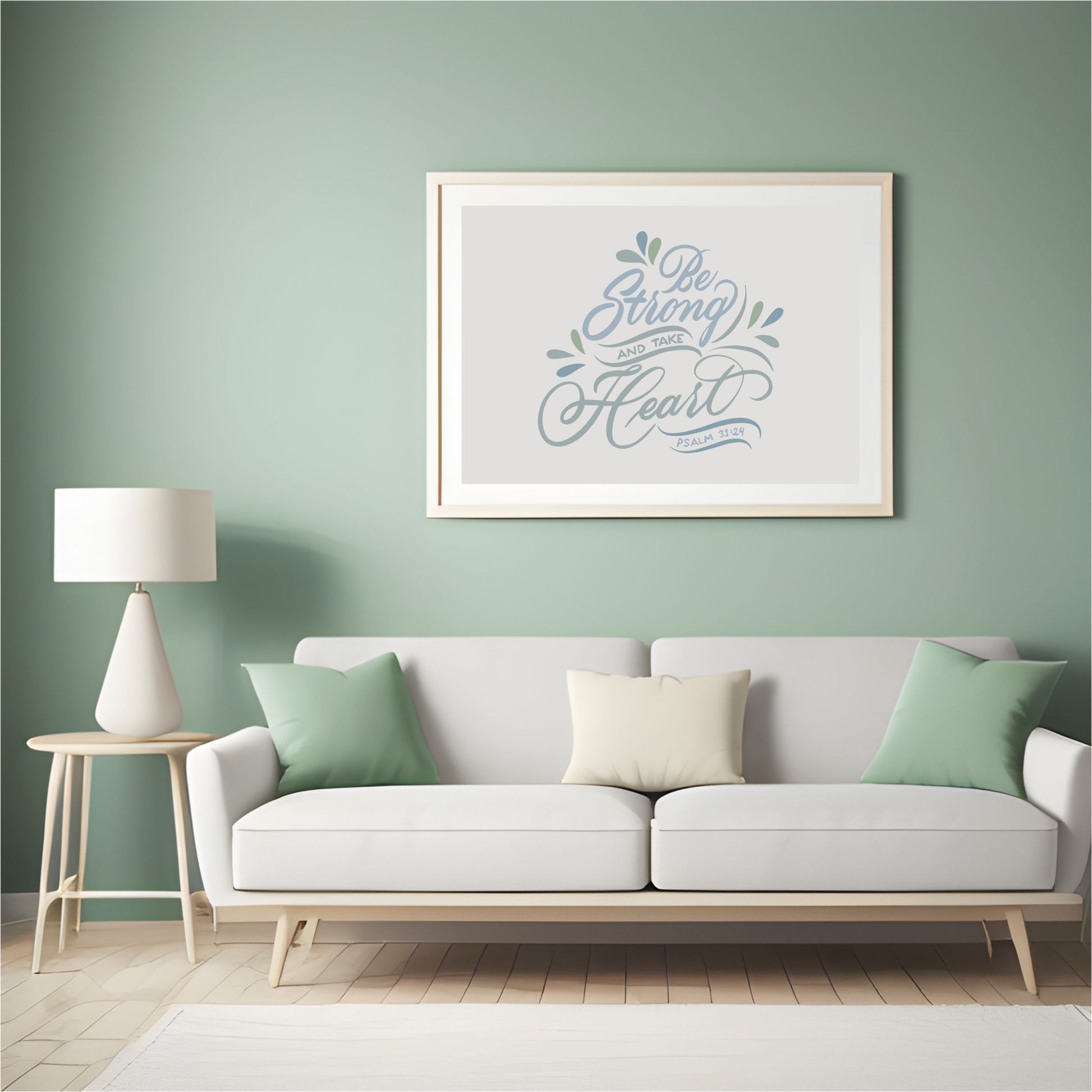 Embrace the timeless wisdom and uplifting spirit of Psalm 31:24 with this exquisite digital art print, "Be Strong and Take Heart." This piece combines the fluid elegance of brush script calligraphy (in subtle blues and green) with the charm of hand lettering to create a visual symphony of faith and inspiration.