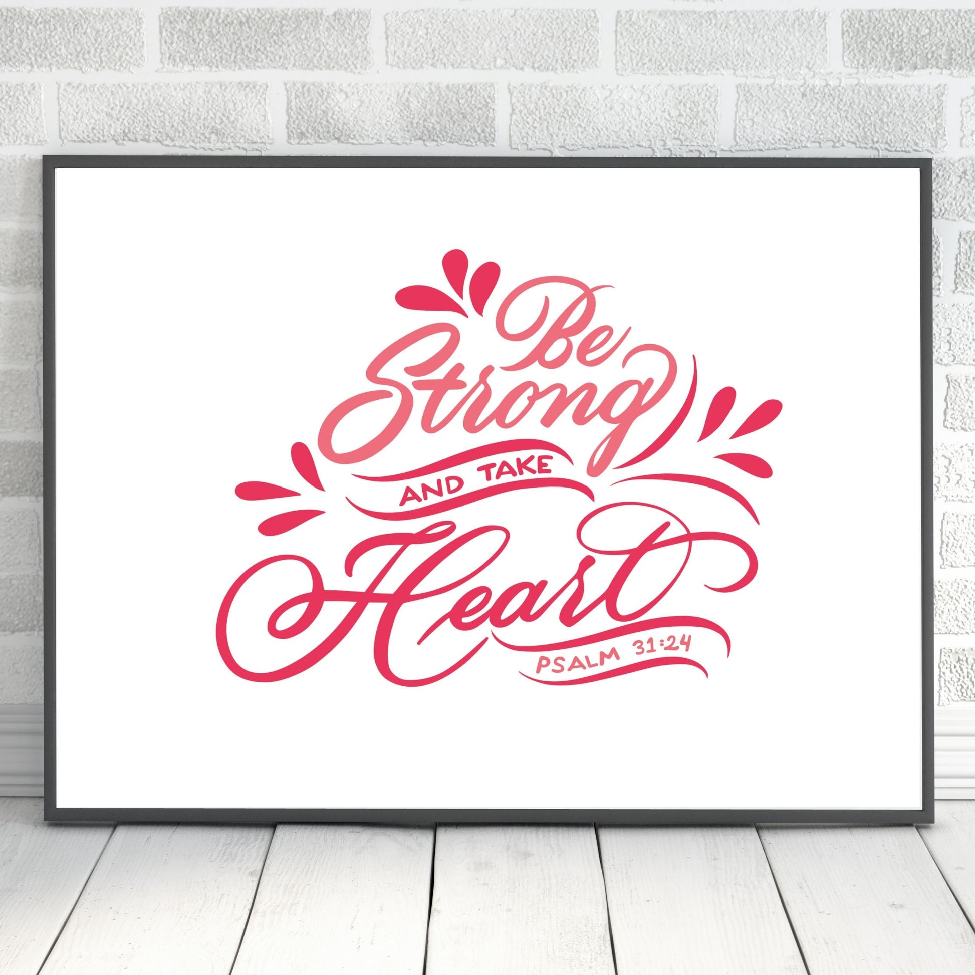 Embrace the timeless wisdom and uplifting spirit of Psalm 31:24 with this exquisite digital art print, "Be Strong and Take Heart." This piece combines the fluid elegance of brush script calligraphy (in pink and red) with the charm of hand lettering to create a visual symphony of faith and inspiration.