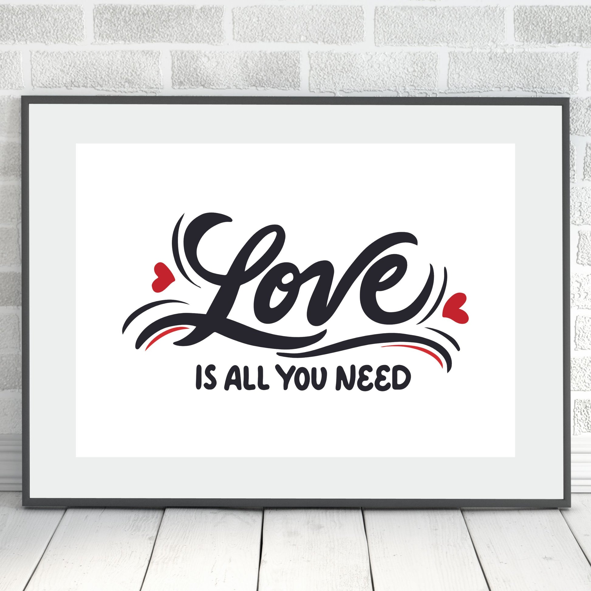 Express the timeless message of love with this unique digital art print, featuring the phrase "Love Is All You Need." This design combines the beauty of brush script calligraphy with intricate hand lettering